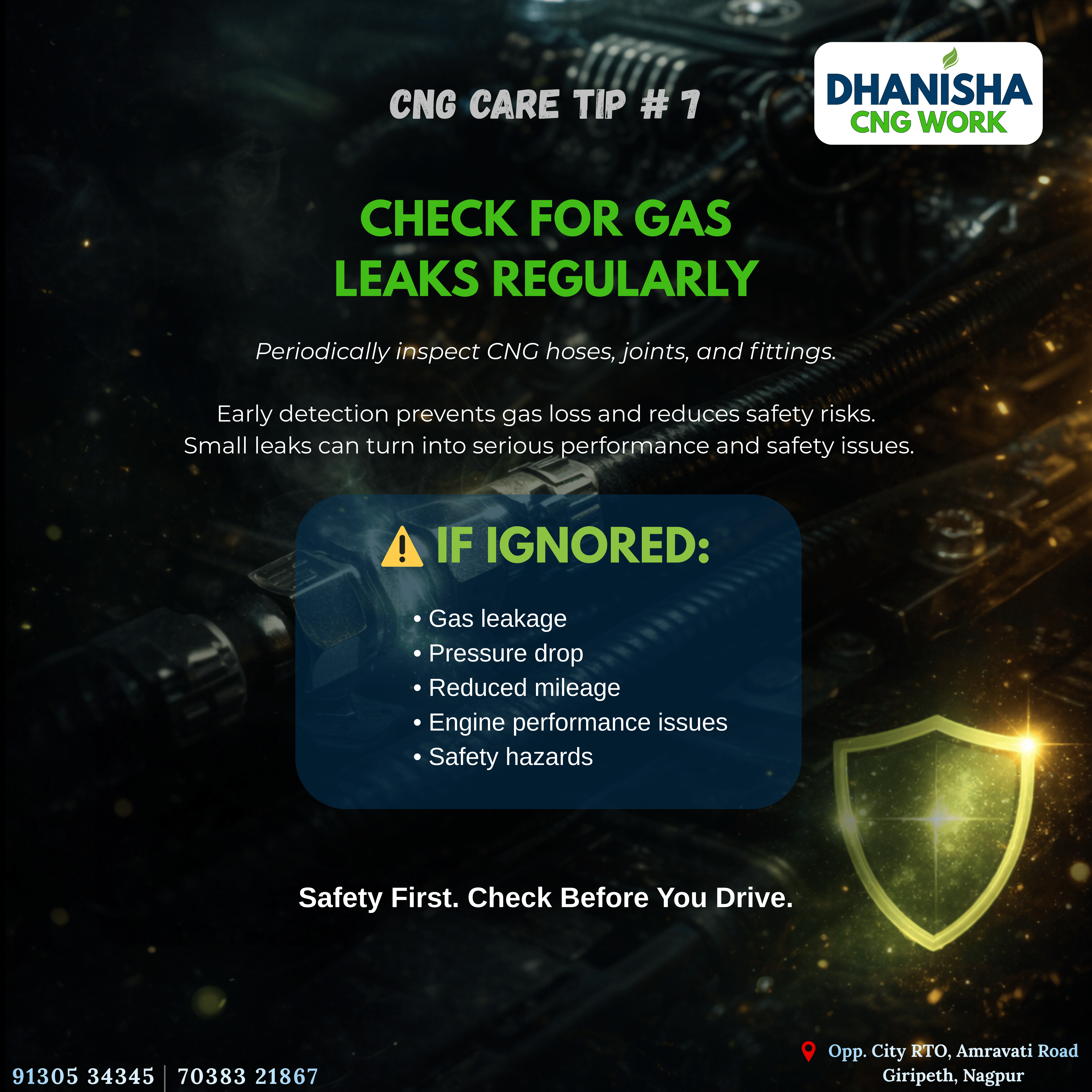 Checking for gas leaks regularly is essential for maintaining the safety and performance of your CNG vehicle. Small leaks in hoses, joints, or fittings can lead to pressure drops, reduced mileage, engine performance issues, and potential safety hazards. Early detection not only prevents gas loss but also protects your vehicle and passengers. At Dhanisha CNG Work, Nagpur, we provide professional CNG inspection and maintenance services to ensure safe, efficient, and reliable vehicle performance.